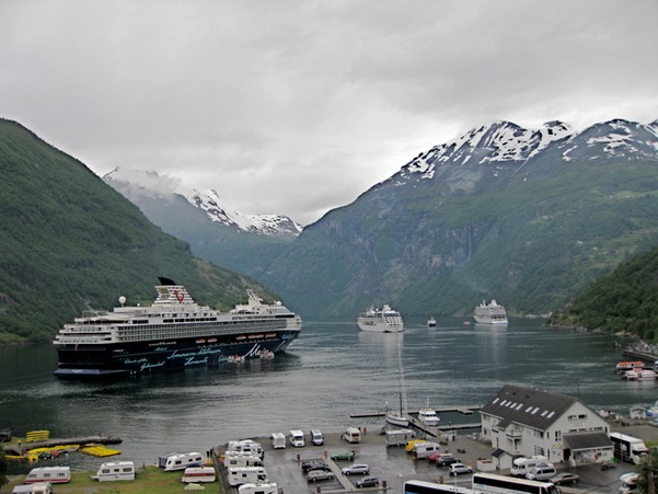 The town was comfortably full of tourists disgorged from two large tour boats in the harbor, and we counted 50 motorhomes that, unlike us, had dared to drive mountains and hairpin curves to get there. In addition to the souvenir shops there was a very good museum half a mile up the hill that we trekked up to in the rain. We took the ferry back to Hellesylt for the night, and today we headed south.